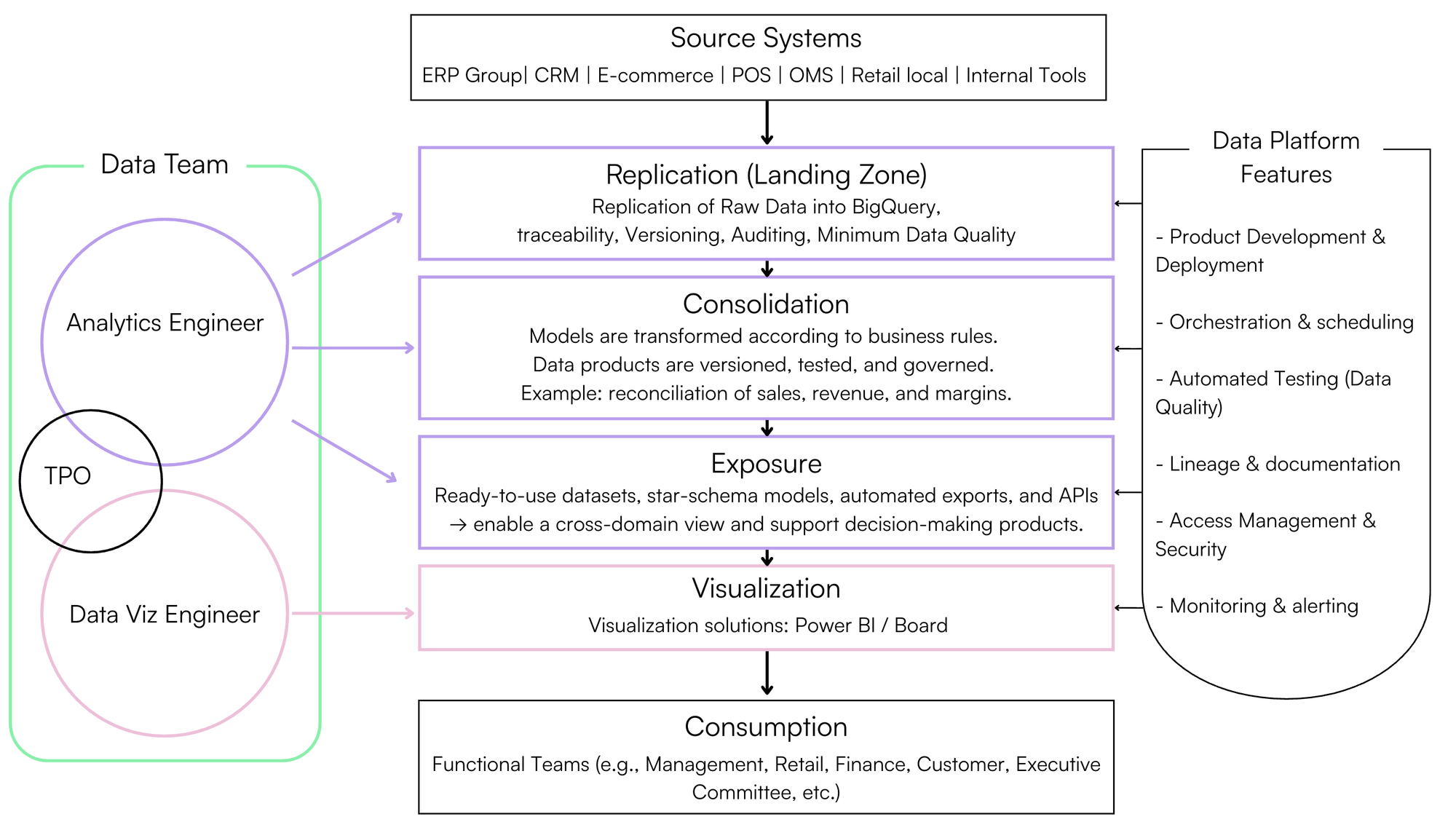 These pillars laid the foundation for a structured and sustainable data function, where each technical product serves a clear business purpose for the teams. The following sections detail how this approach was implemented first through collaboration with business teams, then via the technical architecture supporting performance and reliability.